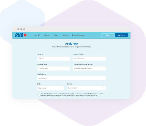 Apply with RHBSuitable for Private Limited, Limited Liability Partnerships and Partnerships